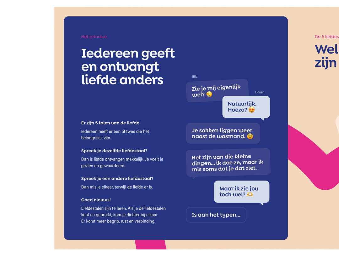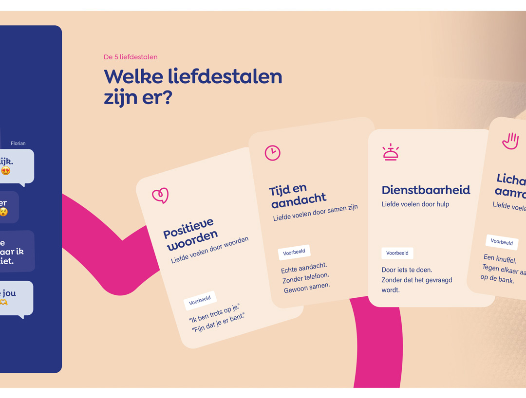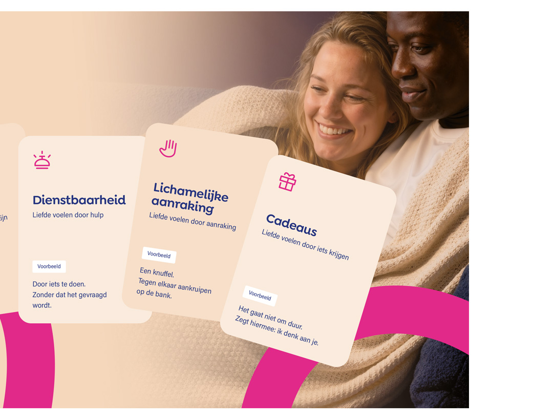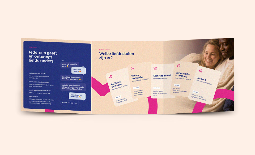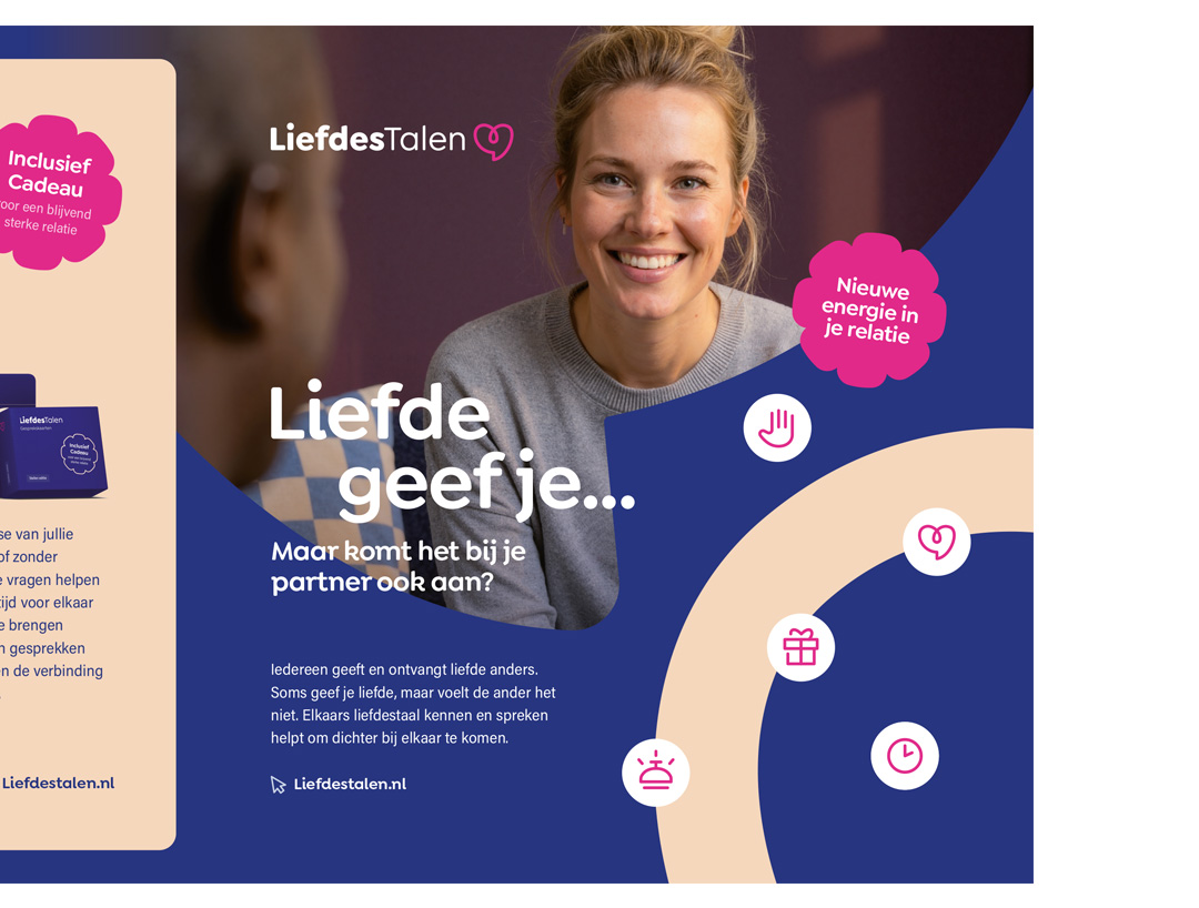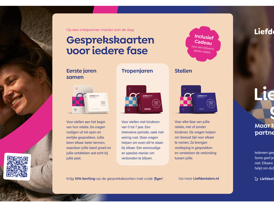 De flyers nodigen uit om de liefdestalentest te doen op Liefdestalen.nl: een korte en krachtige test die inzicht geeft in hoe iemand liefde geeft én ontvangt. In slechts een paar minuten ontdekken mensen wat voor hen (of hun partner) echt het verschil maakt in verbinding.